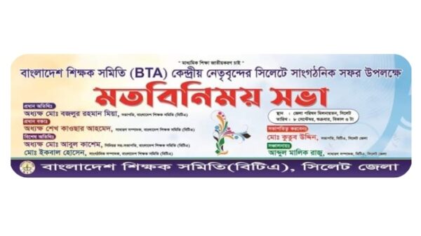 নিজস্ব প্রতিনিধিঃ বাংলাদেশ শিক্ষক সমিতির (BTA) কেন্দ্রীয় নেতৃবৃন্দের সিলেট বিভাগে সাংগঠনিক সফর উপলক্ষ্যে মতবিনিময় সভা আগামীকাল শুক্রবার (৮ সেপ্টেম্বর) বিকাল ৩ টায় সিলেট জেলা পরিষদ হলরুমে অনুষ্ঠিত হবে। মতবিনিময় সভায়